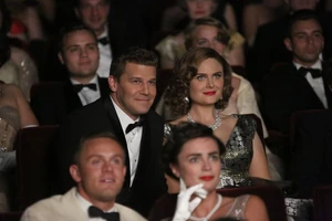 Hodgins and Nigel-Murray do an experiment that explodes just as Booth and Brennan are nearing the room they're in. Booth immediately pushes Brennan up against a wall to protect her from the blast.