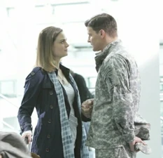 As Brennan is saying goodbye to the team at the airport before she leaves for Indonesia, she sees Booth, who hasn't left for Afghanistan yet, walking towards her in the distance. He tells her that he had to sneak off the military base in order to go to the airport to say goodbye to her. They exchange emotional goodbyes and go their respective ways.