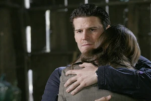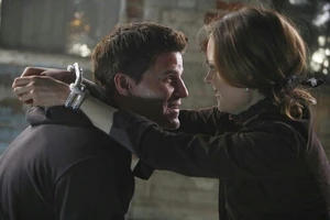 Booth is injured in a bomb explosion meant for Brennan. Despite this, when Brennan is kidnapped and threatened by the rogue FBI agent, Booth leaves the hospital to find Brennan. Despite being severely injured, he lifts Brennan up from a hook that she was hanging on. This is the first time they hug on screen.