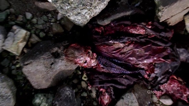 Booth and Brennan are on the scene. The former wonders whether the discovery ruined the couple's wedding night. The latter, naturally, doesn't understand why it would. After examining the remains, Brennan announces that the death was not an accident, and that somebody purposely threw the victim. The group then returns to the lab and Brennan reveals more news: the victim was undergoing a dental procedure. Vincent then realizes that the skin is moving. Camille cuts the skin and a green, foamy substance oozes out. Camille yells for everybody to move away from the body, then announces a lockdown.