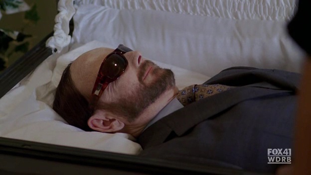 Inside, Booth slyly puts the moves on Erin Miller, the estate lawyer, who happens to sport a Cleopatra haircut. "It wasn't a very pleasant lunch," Miller says. She explains Hank's stepmother is very sick and Hank and his stepbrother Barney were the heirs to her fortune. Back at the lab, Cam has examined the contents of Hank's stomach and determined the man did not die from eating poisoned sushi. Hodgins says if lunch didn't kill the man, perhaps breakfast did. Interestingly, Hank's amorous wife mentioned earlier the deceased was served tea for breakfast. Hodgins, Cam and Sweets then hustle the body back to the home. The only problem: the trio unwittingly leaves the dead man's glasses behind.