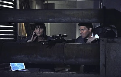 Cut to the courthouse, where Booth tells Bones they know the "where," but not the "who." Angela, in the meantime, looks for surrounding locations which match the practice shot scenario -- and identifies a nearby rooftop. B&B head to said rooftop, but don't find Jacob. Did Angela get the locale wrong? The partners call Caroline, who explains the only case left in the courthouse concerns a dirty cop. "That sounds like Broadsky's target," says Booth, before realizing the men's bathroom is identical to the women's. Booth runs to the other side of the roof. Sure enough, he uses his own sniper rifle to spot Jacob aiming at the men's bathroom from another roof some distance away. Booth fires -- hitting Jacob's weapon. Jacob flees. "We missed him," Booth says. "He's long gone." Hmm. Did our FBI guy miss his target on purpose to avoid another kill?